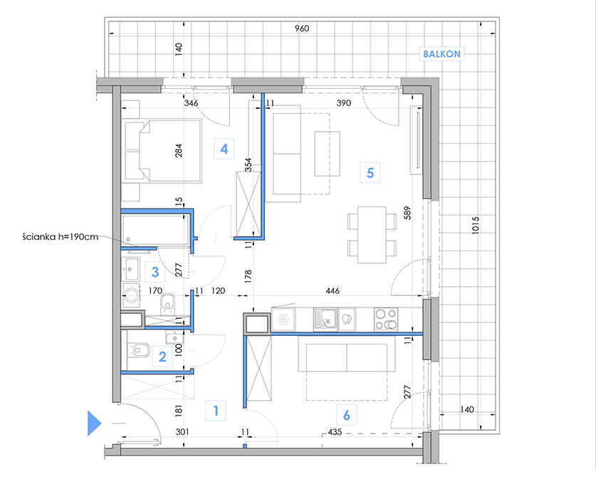 Salon + aneks kuchenny: 23.96m2